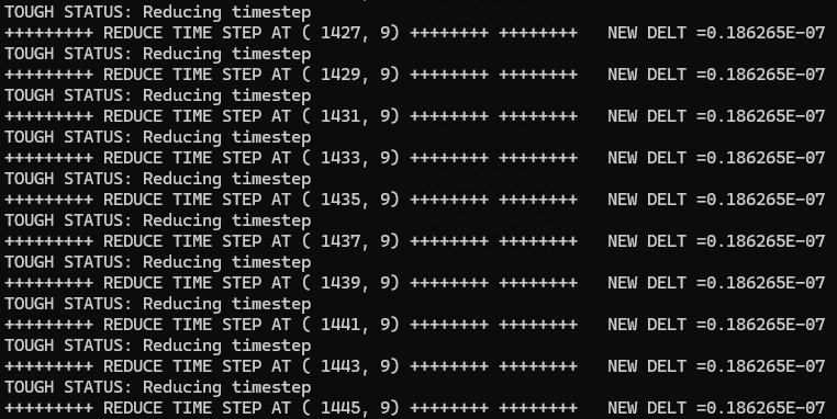 I am simulating an injector and producer doublet in a gas reservoir with TOUGH3-EOS7C. It runs well for the first few years and then struggles to converge with very small time steps (screenshot below).
