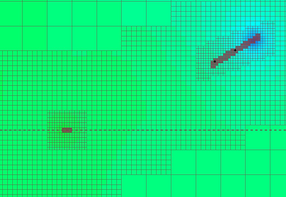 I looked into the OUTPUT file and did not find any error message. The program struggles to converge mainly on two cells (indicated by the black cross in the screenshot below). But the variables at these two locations look good to me. I do have local refinement as small as 1m by 1m surrounding the wells. My injection rate and production rate are both 30 kg/s.