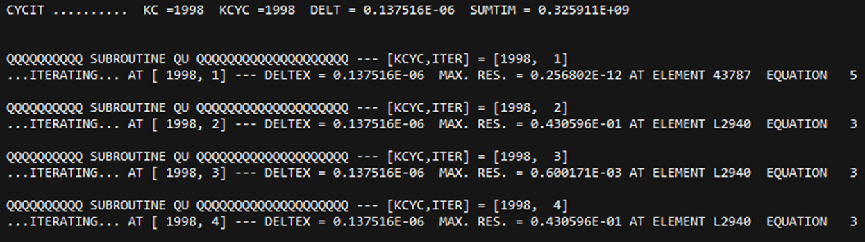 (2) at KCYC=1998 the iteration process is unable to converge with a very tiny step of 0.137E-6 s. The non converging element is L2940 and the non converging eq is n. 3, the mass balance of NCG. This issue may be linked to the one described above, if phase transition is present in the same element.