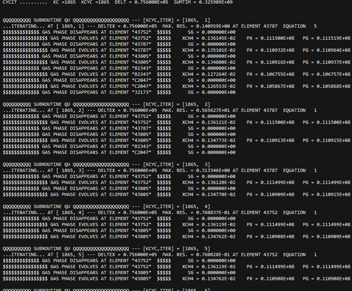 I am simulating an injector and producer doublet in a gas reservoir with TOUGH3-EOS7C. It runs well for the first few years and then struggles to converge with very small time steps (screenshot below).